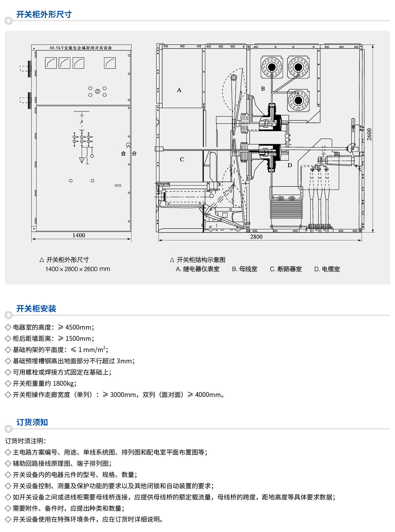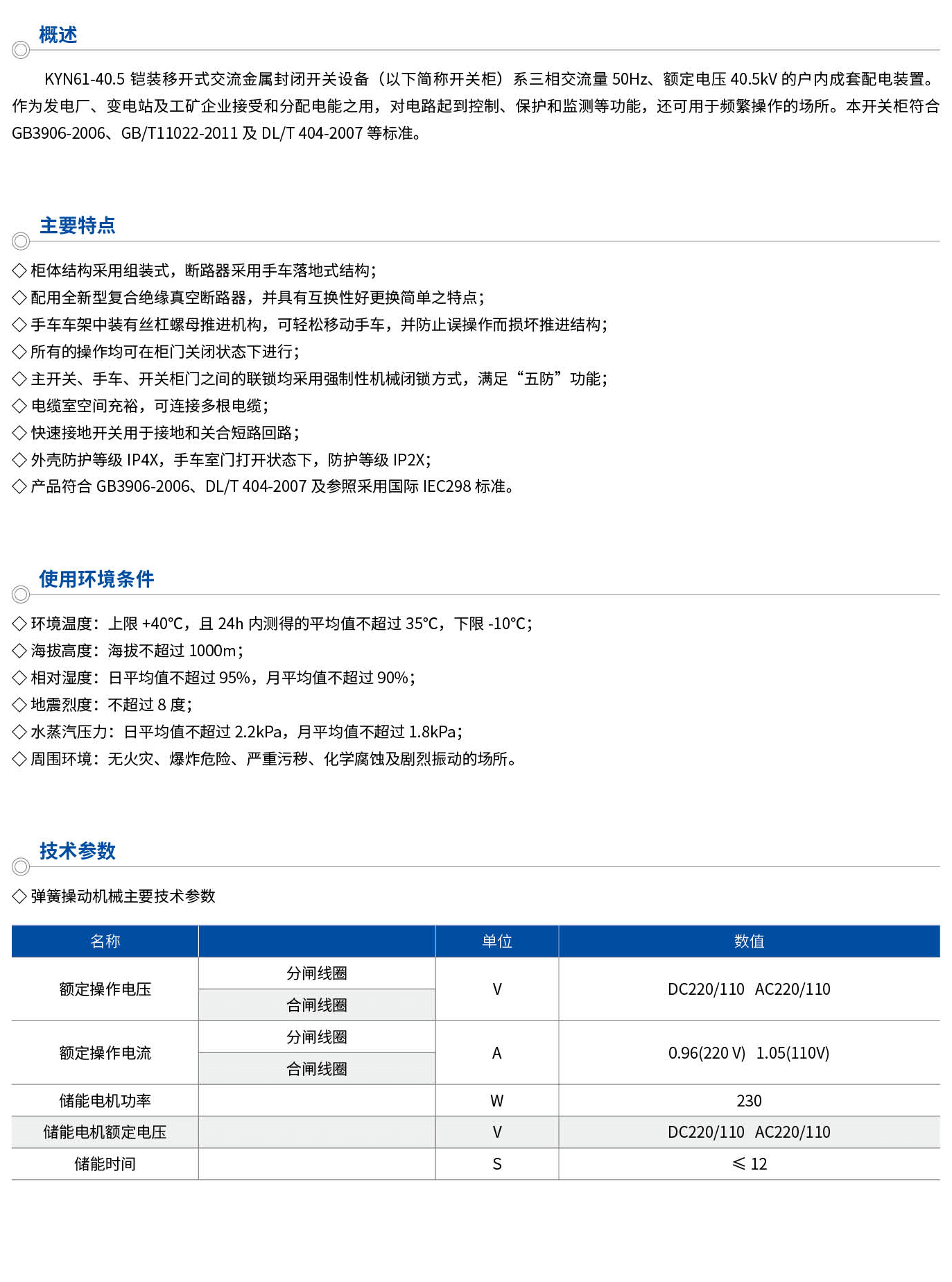 KYN61-40.5鎧裝移開式交流金屬封閉開關(guān)設(shè)備(以下簡稱開關(guān)柜)系三相交流量50Hz、額定電壓40.5kV的戶內(nèi)成套配電裝置。作為發(fā)電廠、變電站及工礦企業(yè)接受和分配電能之用,對電路起到控制、保護和監(jiān)測等功能,還可用于頻繁操作的場所。本開關(guān)柜符合GB3906-2006、GB/T11022-2011及DL/T404-2007等標準。