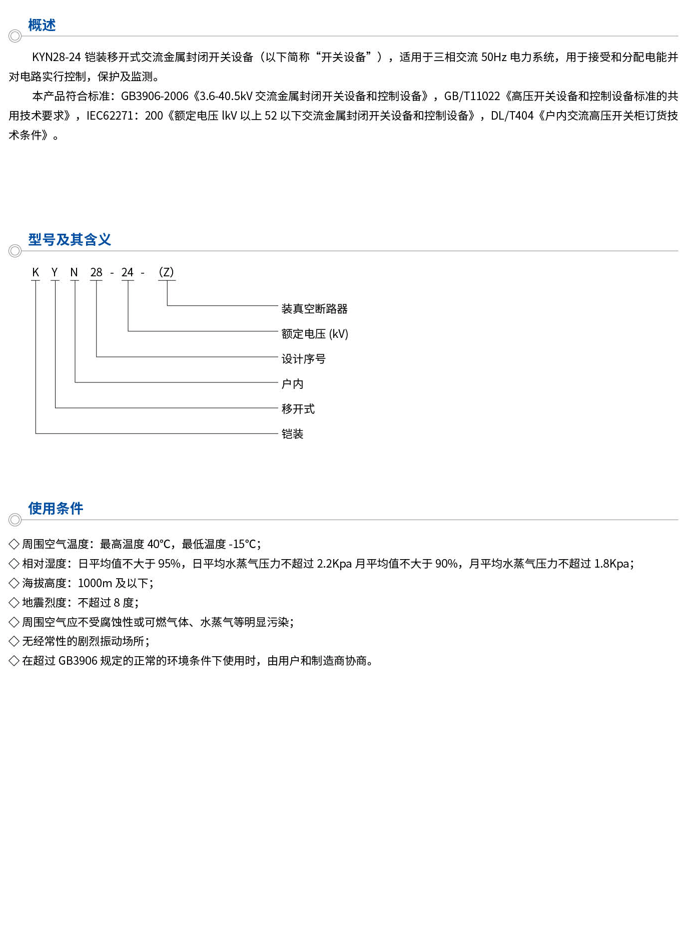 KYN28-24鎧裝移開式交流金屬封閉開關(guān)設(shè)備(以下簡(jiǎn)稱“開關(guān)設(shè)備”),適用于三相交流50Hz電力系統(tǒng),用于接受和分配電能并對(duì)電路實(shí)行控制,保護(hù)及監(jiān)測(cè)。本產(chǎn)品符合標(biāo)準(zhǔn):GB3906-2006《3.6-40.5kW交流金屬封閉開關(guān)設(shè)備和控制設(shè)備》,GB/T11022《高壓開關(guān)設(shè)備和控制設(shè)備標(biāo)準(zhǔn)的共用技術(shù)要求》,IEC62271:200《額定電壓kV以上52以下交流金屬封閉開關(guān)設(shè)備和控制設(shè)備》,DL/T404《戶內(nèi)交流高壓開關(guān)柜訂貨技術(shù)條件》。