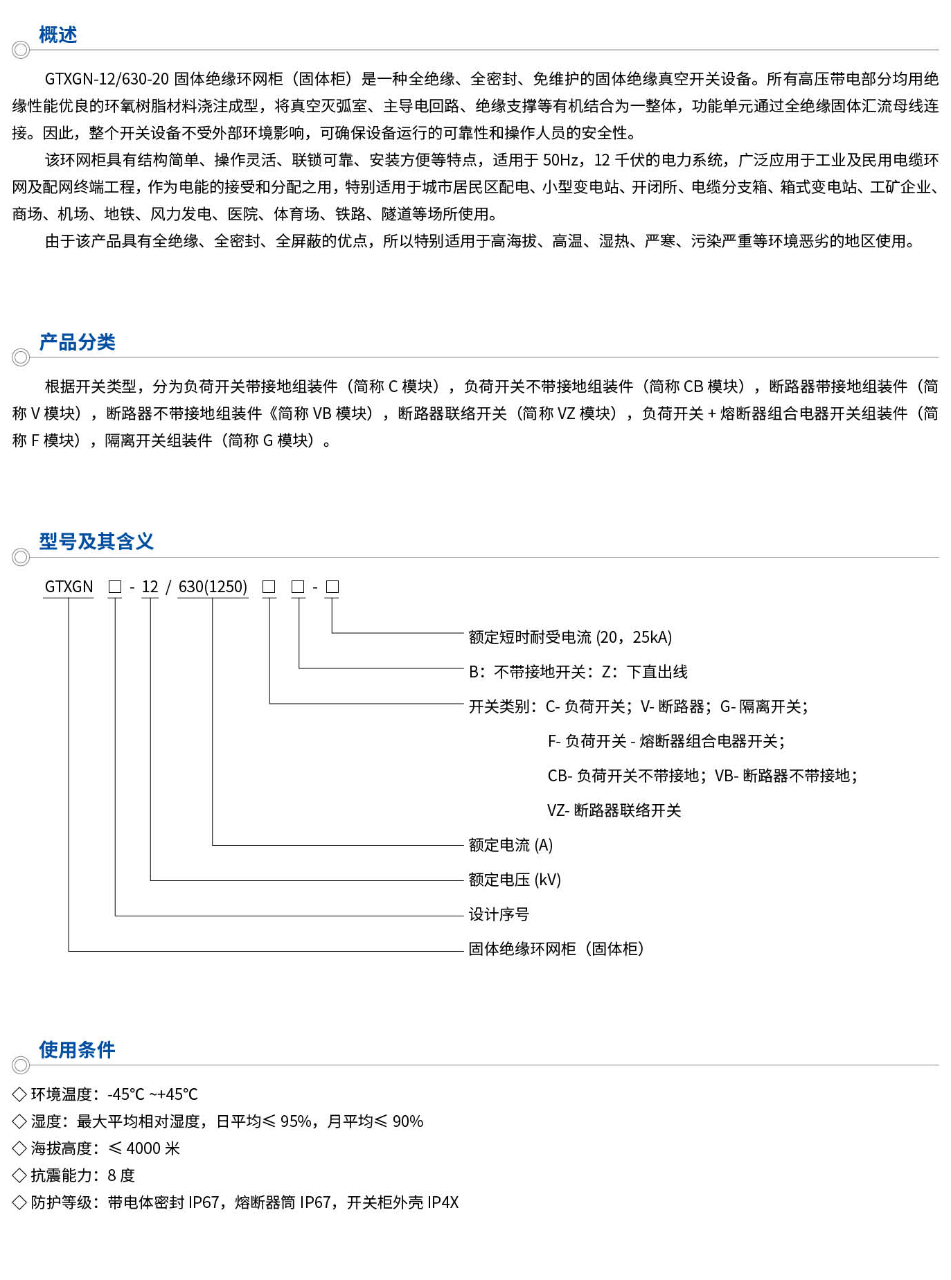 GTXGN-12/630-20固體絕緣環(huán)網(wǎng)柜(固體柜)是一種全絕緣、全密封、免維護的固體絕緣真空開關(guān)設(shè)備。所有高壓帶電部分均用絕緣性能優(yōu)良的環(huán)氧樹脂材料澆注成型,將真空滅弧室、主導電回路、絕緣支撐等有機結(jié)合為一整體,功能單元通過全絕緣固體匯流母線連接。因此,整個開關(guān)設(shè)備不受外部環(huán)境影響,可確保設(shè)備運行的可靠性和操作人員的安全性。該環(huán)網(wǎng)柜具有結(jié)構(gòu)簡單、操作靈話、聯(lián)鎖可靠、安裝方便等特點,適用于50Hz,12千伏的電力系統(tǒng),廣泛應(yīng)用于工業(yè)及民用電纜環(huán)網(wǎng)及配網(wǎng)終端工程,作為電能的接受和分配之用,特別適用于城市居民區(qū)配電、小型變電站、開閉所、電纜分支箱、箱式變電站、工礦企業(yè)、商場、機場、地鐵、風力發(fā)電、醫(yī)院、體育場、鐵路、隧道等場所使用。由于該產(chǎn)品具有全絕緣、全密封、全屏蔽的優(yōu)點,所以特別適用···