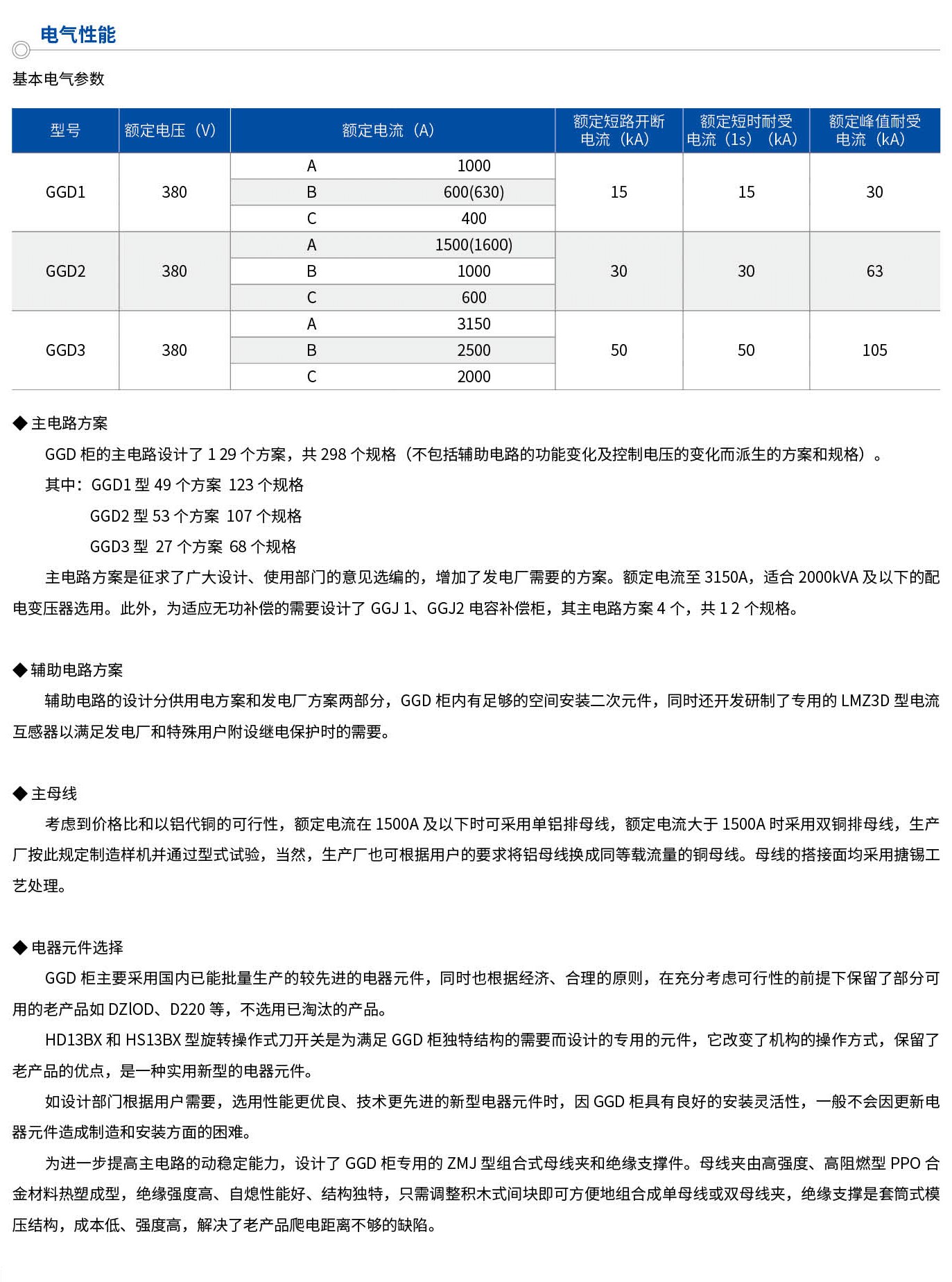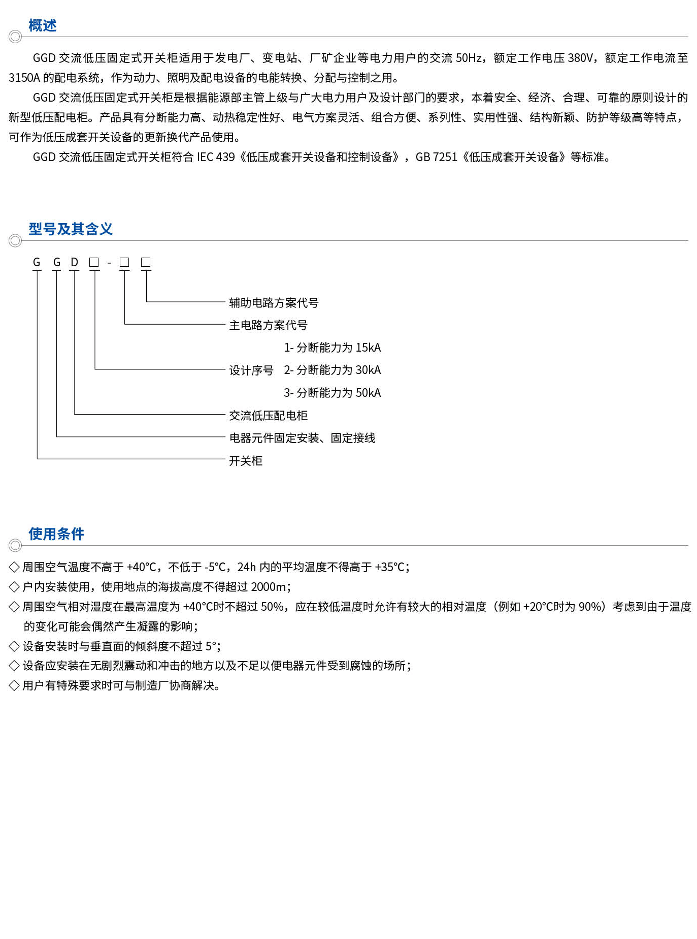 GGD交流低壓固定式開關柜適用于發(fā)電廠、變電站、廠礦企業(yè)等電力用戶的交流50HZ,額定工作電壓380V,額定工作電流至3150A的配電系統(tǒng),作為動力、照明及配電設備的電能轉換、分配與控制之用。GGD交流低壓固定式開關柜是根據能源部主管上級與廣大電力用戶及設計部門的要求,本著安全、經濟、合理、可靠的原則設計的新型低壓配電柜。產品具有分斷能力高、動熱穩(wěn)定性好、電氣方案靈活、組合方便、系列性、實用性強、結構新穎、防護等級高等特點,可作為低壓成套開關設備的更新換代產品使用。GGD交流低壓固定式開關柜符合EC439《低壓成套開關設備和控制設備》,GB7251《低壓成套開關設備》等標準。